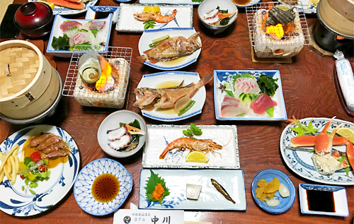 宿の夕食です。サザエのつぼ焼きやカニまであってかなり豪華!!