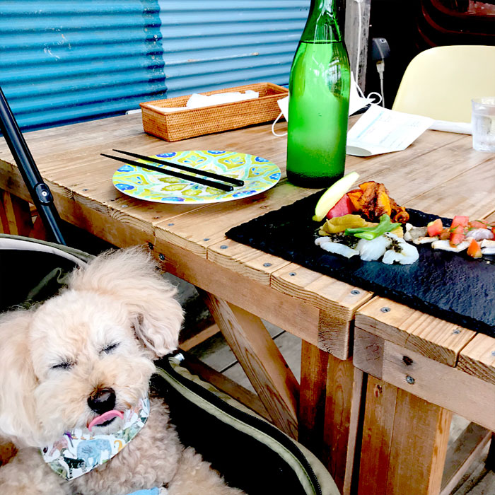 実は魚のかねあさんは吠えない犬なら店内でも入れてもらえます。ただ、お店の周りに猫さんが4匹いてそれに吠えてしまいそうだったので、私たちはテラス席を選びました。